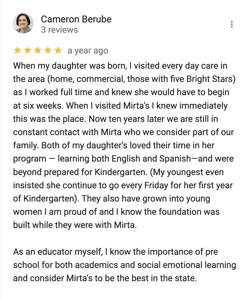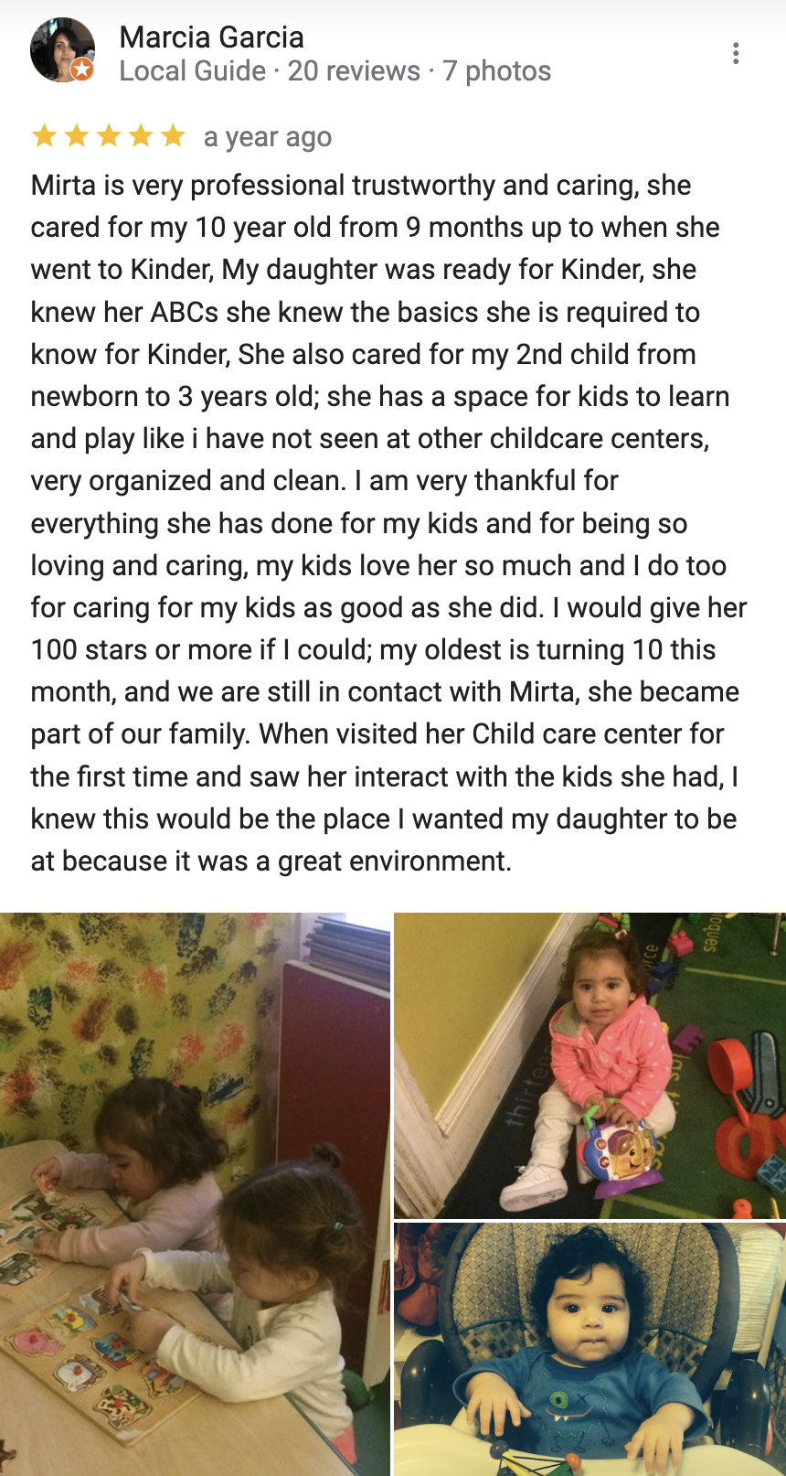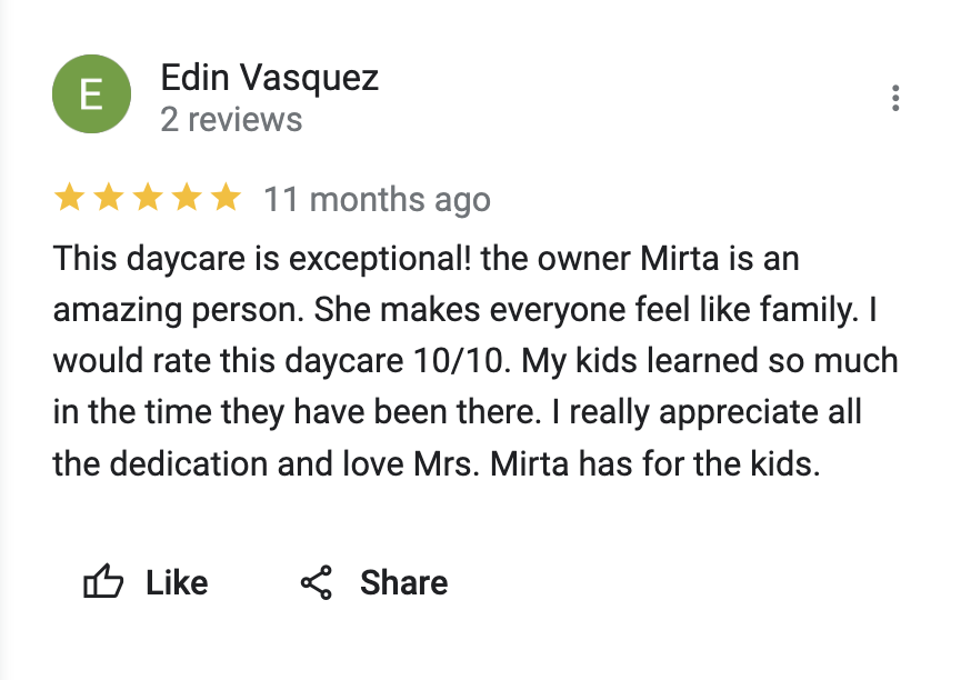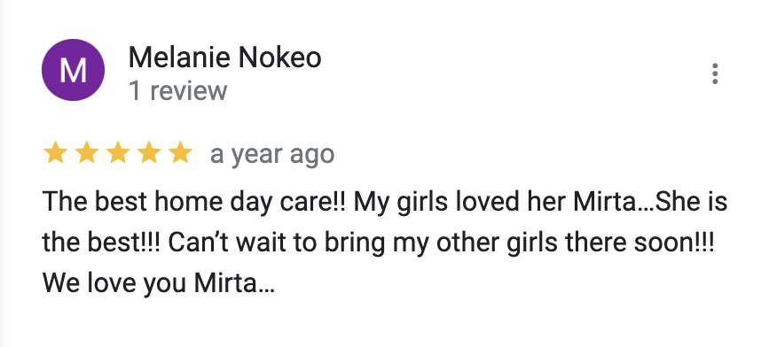 At Mirta’s Family Home Daycare, we believe in creating a warm, home-like environment where your child feels safe, valued, and inspired to explore the world around them. Our dedicated approach combines personalized care, creative play, and early learning, ensuring every child grows with confidence and joy.